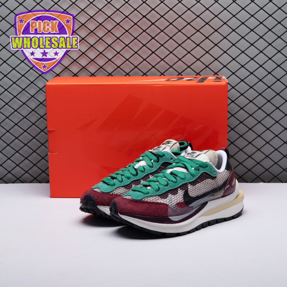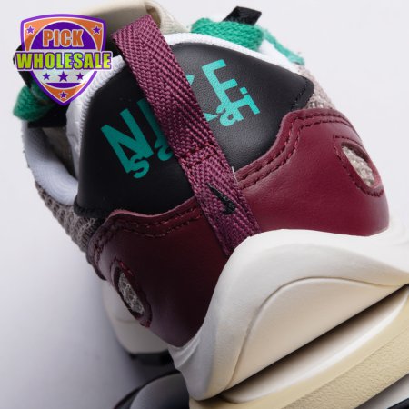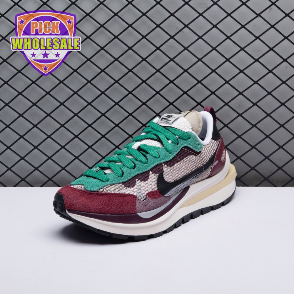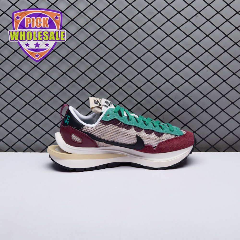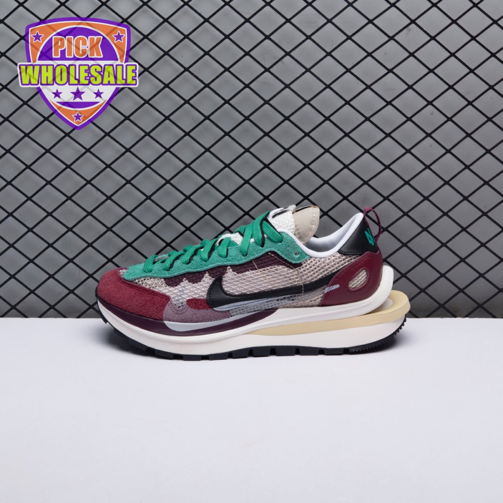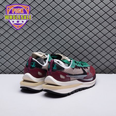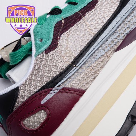 Made in partnership with the progressive Japanese fashion label, the Sacai x Nike VaporWaffle SP "Villain Red" shows off a layered design that recalls the brands" original LDV Waffle collaboration from 2019. The sneaker"s khaki mesh upper, accented with burgundy suede overlays and a green suede eyestay, doubles up on the tongue, laces and Nike Swoosh branding. An off-white finish is applied to the stacked midsole, featuring a wedge insert that literally splits the heel.